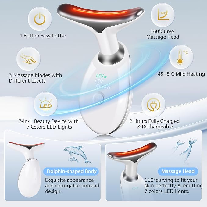 Designed for both comfort and results, this massager soothes tired muscles while stimulating collagen production. The ergonomic design fits perfectly along the neck and jawline, enhancing your skincare routine with gentle warmth and vibrations.